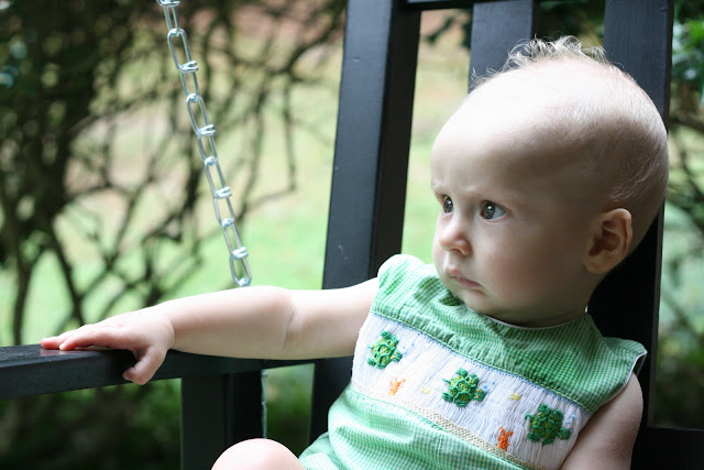 Now he's not sure what to do in his bouncy seat and swing. He sits up and looks around. In the swing, he'll rock himself. Which is why I'm thinking it's time to take that thing down.
